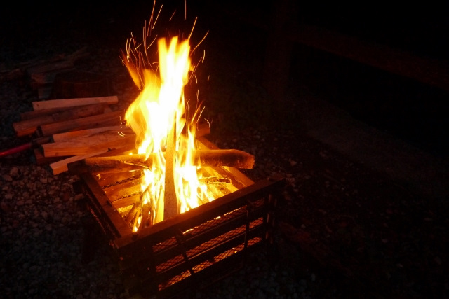 サンプルキャンプ場では、キャンプファイヤーを楽しむことができます。焚火を囲んで楽しい時間を過ごしてください。